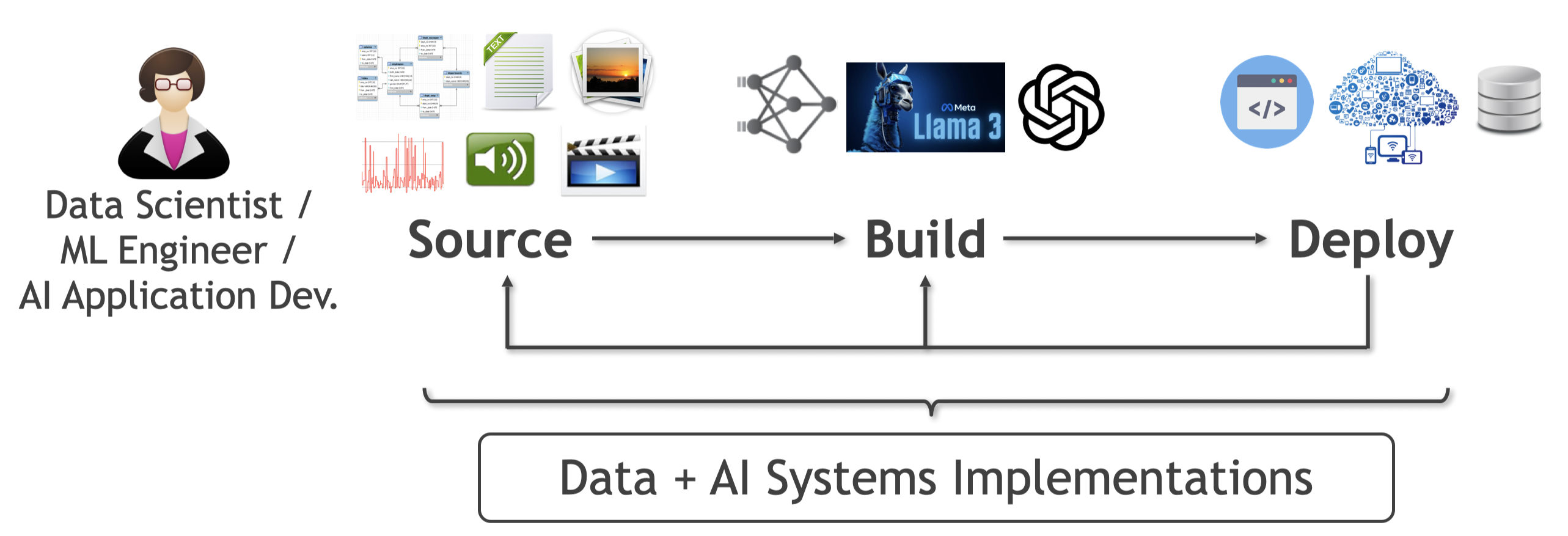 Arun's Data Analytics (ADA) Lab @ UCSDIntroductionAs the scale, complexity, and variety of data grows (aka Big Data), the use of machine learning (ML) and artificial intelligence (AI) techniques to make sense of, and interact with, such data — collectively called predictive data analytics, statistical data analytics, ML-based data analytics, or simply advanced data analytics (also ADA!) — is increasingly critical for data-driven applications in the enterprise, Web, science, and other domains. Alas, building and deploying ML/AI-powered data analytics applications still involves far too many bottlenecks that slow down the lifecycle of such applications, raise costs, frustrate many application users, and in some cases, make high-quality data-driven decision making almost impossible. The mission of the ADALab is to democratize advanced data analytics by making it dramatically easier, faster, and cheaper to build and deploy ML/AI-powered data analytics applications throughout their lifecycle. We are an academic research group headed by Dr. Arun Kumar, and we are a part of the Department of Computer Science and Engineering (CSE) and the Halicioglu Data Science Institute at the University of California, San Diego (UCSD). We are members of CSE's Database Lab and affiliate members of the Artificial Intelligence Group and Center for Networked Systems. Overview of Our ResearchThe ADA lifecycle typically revolves around data scientists, ML/AI engineers, and AI application developers. Based on conversations with dozens of such data/AI professionals, we abstract the ADA lifecyle as follows. After identifying the tasks where ML/AI might benefit their application in terms of business impact or scientific insights, they steer three main processes, as illustrated below:
